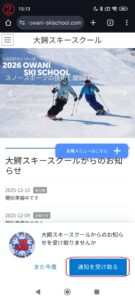 「大鰐スキースクール」アプリをインストールすると、開校状況やゲレンデ情報のお知らせがスマホに届く様になります。