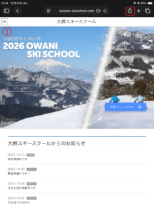 1)スマートフォンのブラウザで「大鰐スキースクール」を検索します。右上の赤枠で囲われたアイコンをクリックしてください。