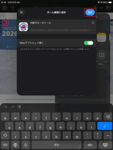 3)「ホーム画面へ追加」画面で右上の赤枠で囲われた「追加」をクリックしてください。