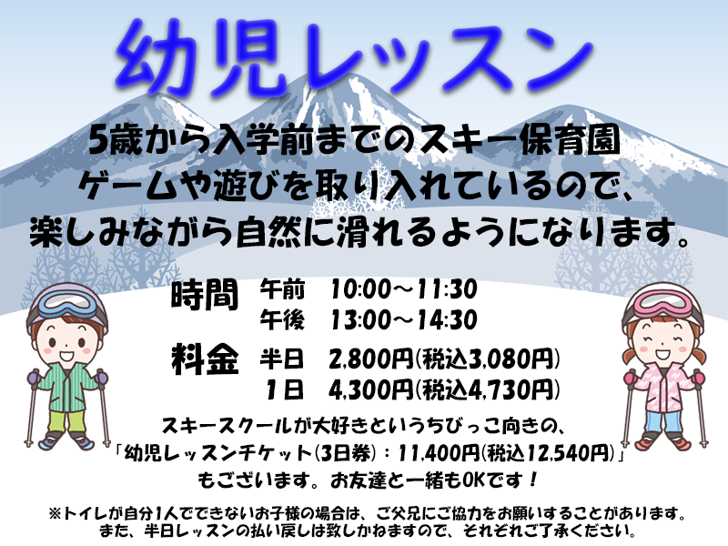 | 幼児スペシャル | PM3:15~4:15 ※ご予約をお勧めします! ※スキー場クローズ時間によりレッスン時間の変更も可能です。 |